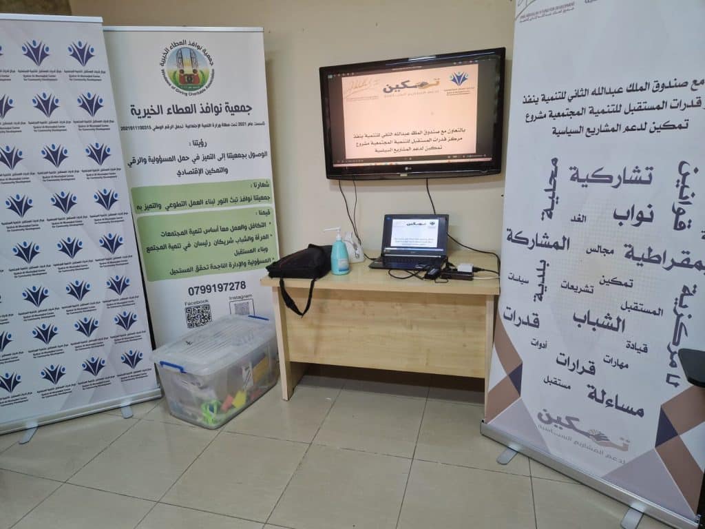حيث تم التدريب بالتعاون مع جمعية نوافذ العطاء في منطقة طارق في العاصمة عمان وذلك المجموعة الشبابية في في العاصمة عمان منطقة شرق عمان حول العديد من المهارات زالتدريبات المتقدمة والمقدمة لهم التي تتضمن العديد من المحاور والمواضيع منها بناء القدرات للمشاركين والمشاركات وتقديم والتدريبات الخاصة لهم حول المهارات القيادية ، ومهارات الاتصال والتواصل ، والمهارات المتعلقة بالتفاوض وتعريفهم على القوانين والتشريعات المتعلقة بالقوانين الانتخابات النيابية والمجالس البلدية ومجالس المحافظات اللامركزية والحكم المحلي وطرق مخاطبة صناع القرار وطرف الافكار والحلول المجتمعية لدعم المساركة السياسية للشباب والشابات في المناطق الاقل مشاركة.